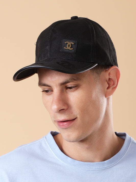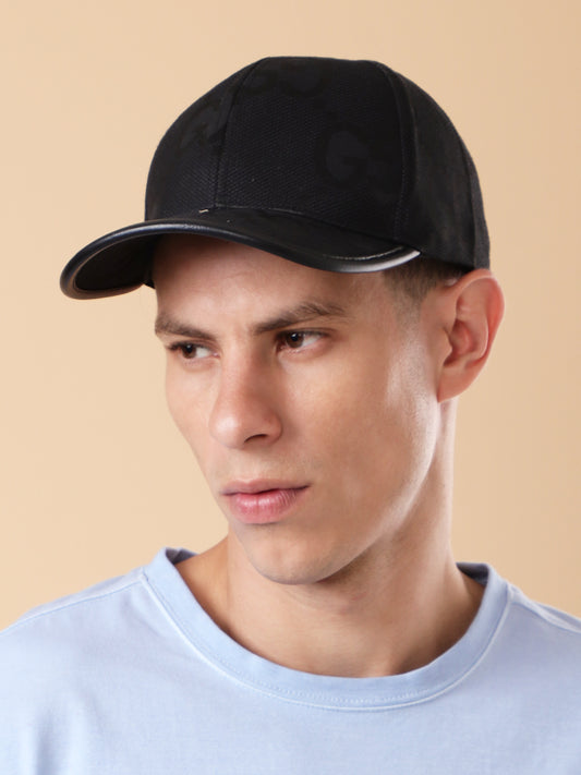 Sleek Black 'GG' Pattern Cap - Textured Design & Faux Leather Brim