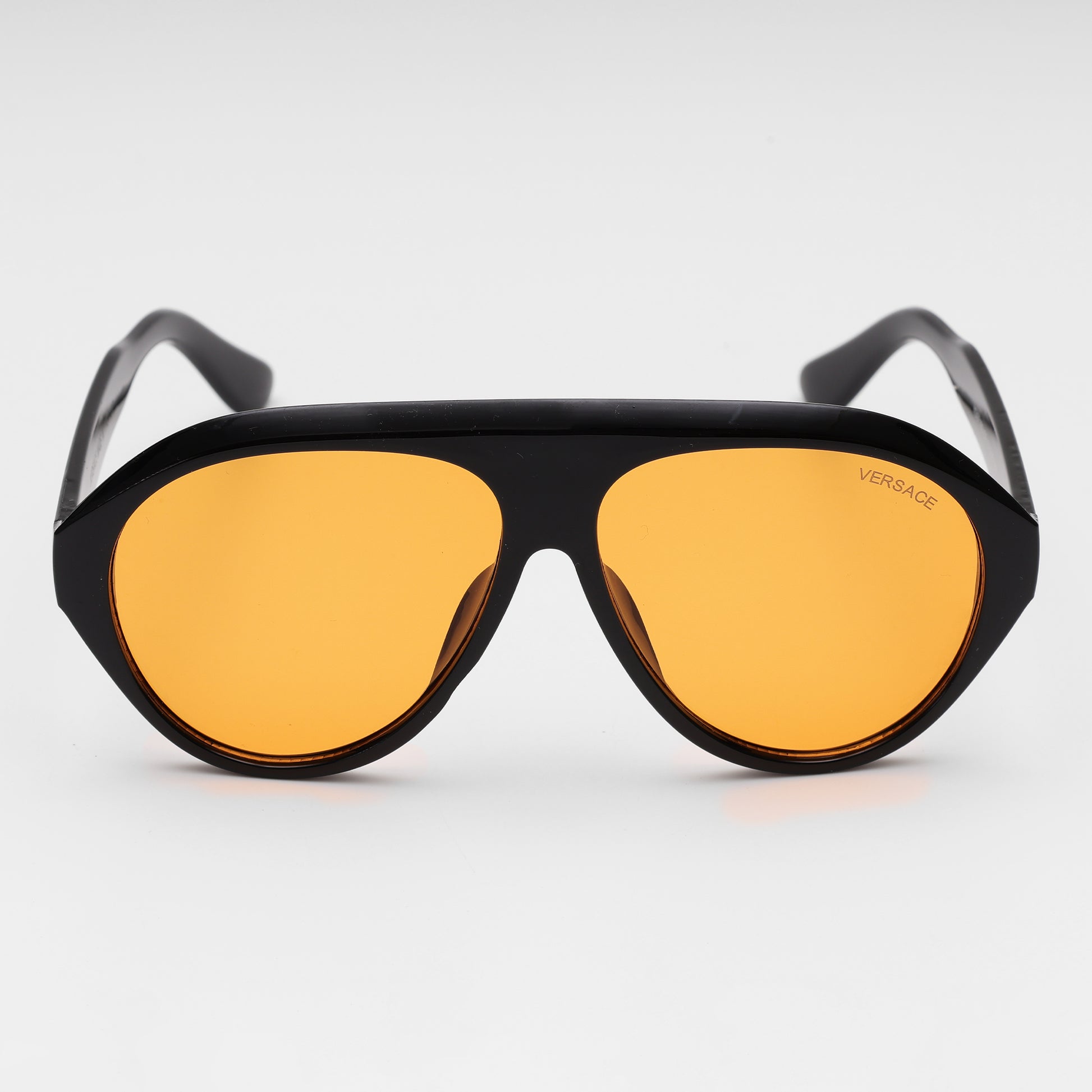 Turn heads wherever you go with the Versace Amber Lens Shield Sunglasses. Crafted with bold black acetate frames and striking amber-tinted lenses, this statement accessory blends retro charm with modern flair. The sleek silhouette and signature Versace logo on the temples reflect unmistakable Italian luxury, while the tinted lenses offer full UV protection with a warm, golden hue that flatters every skin tone.