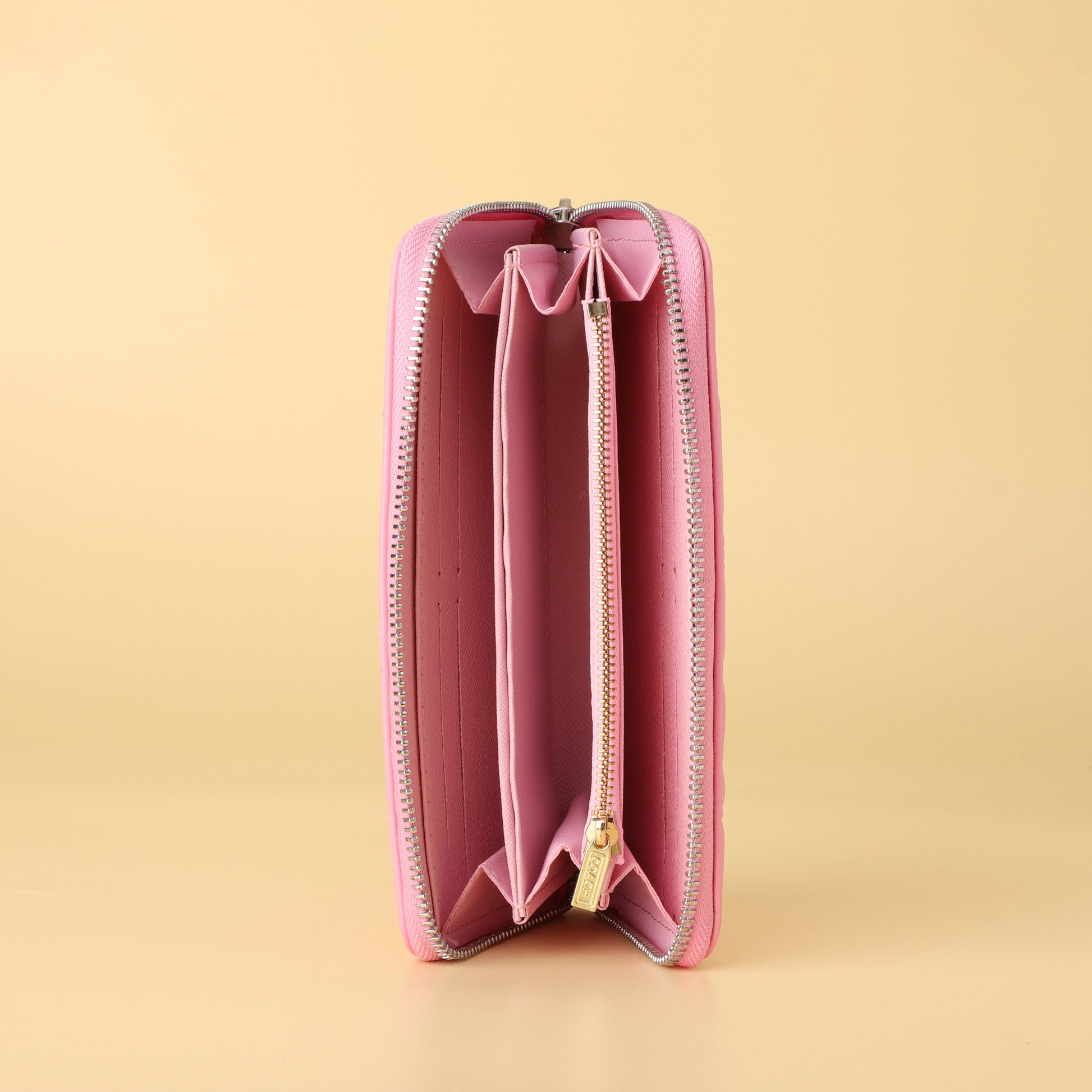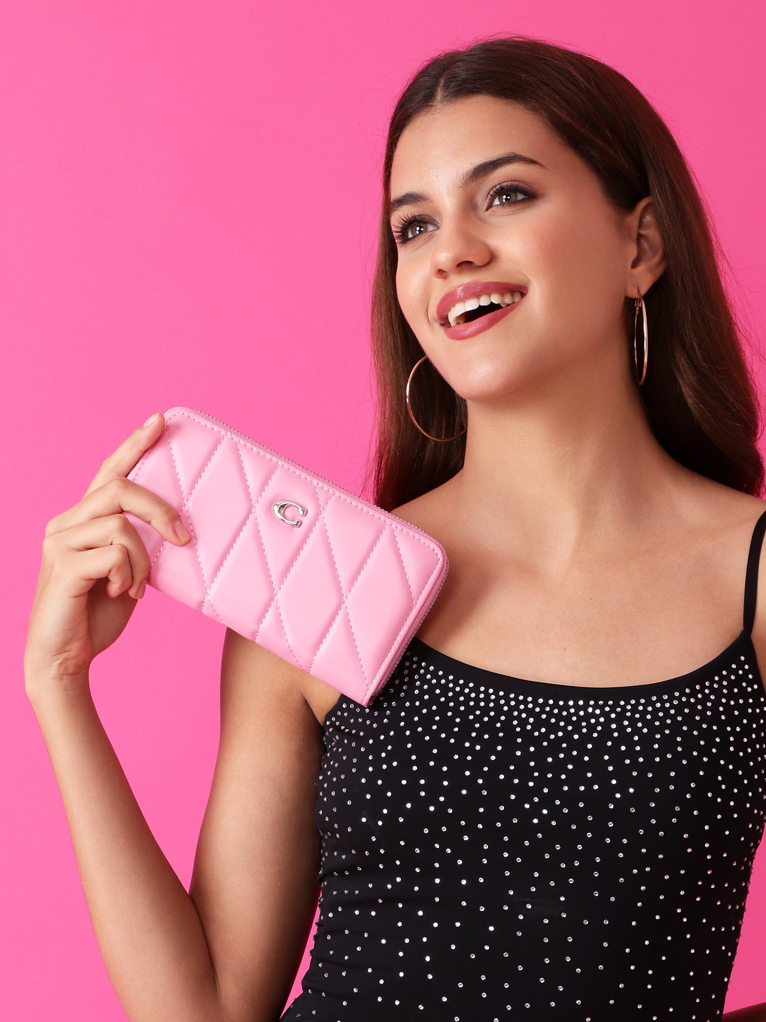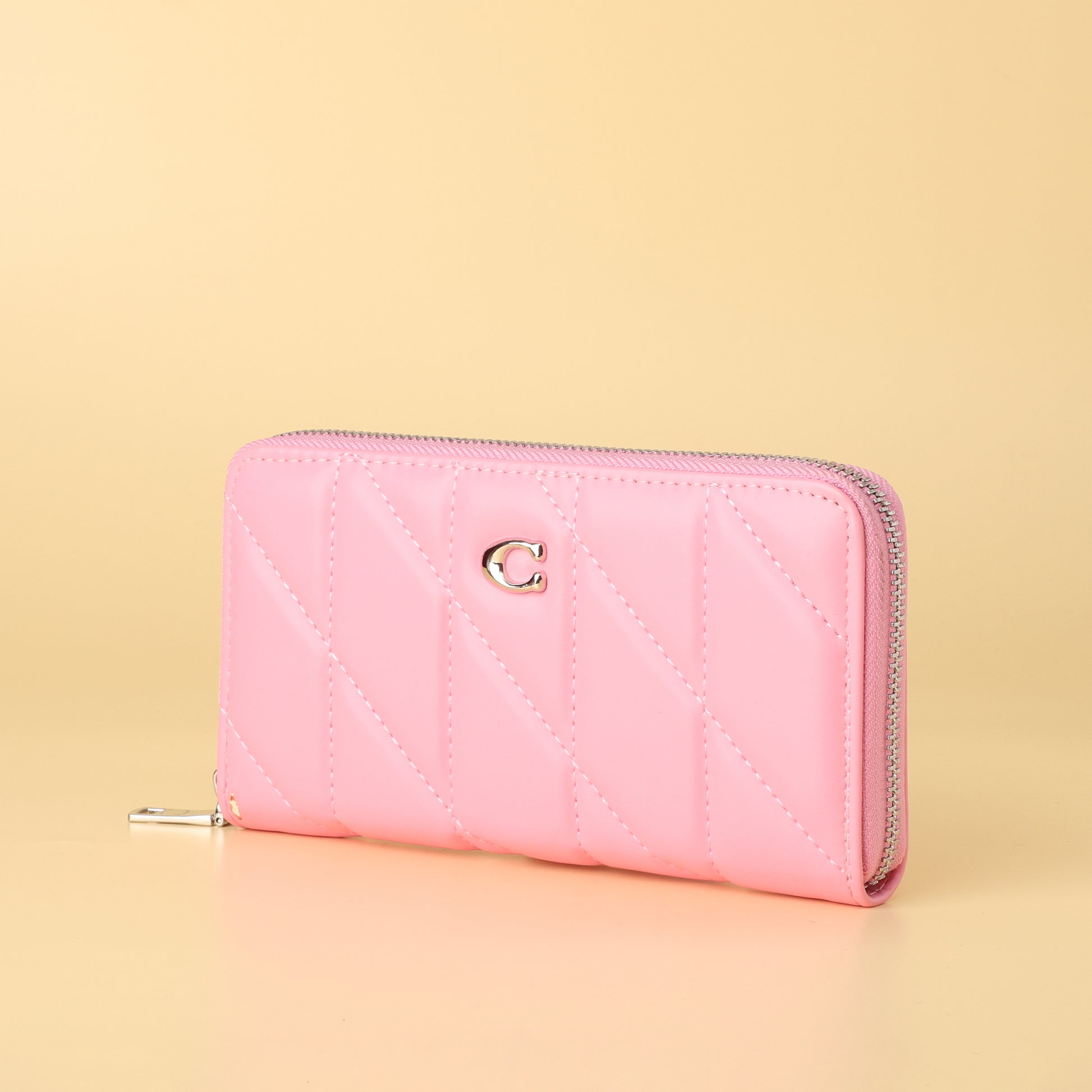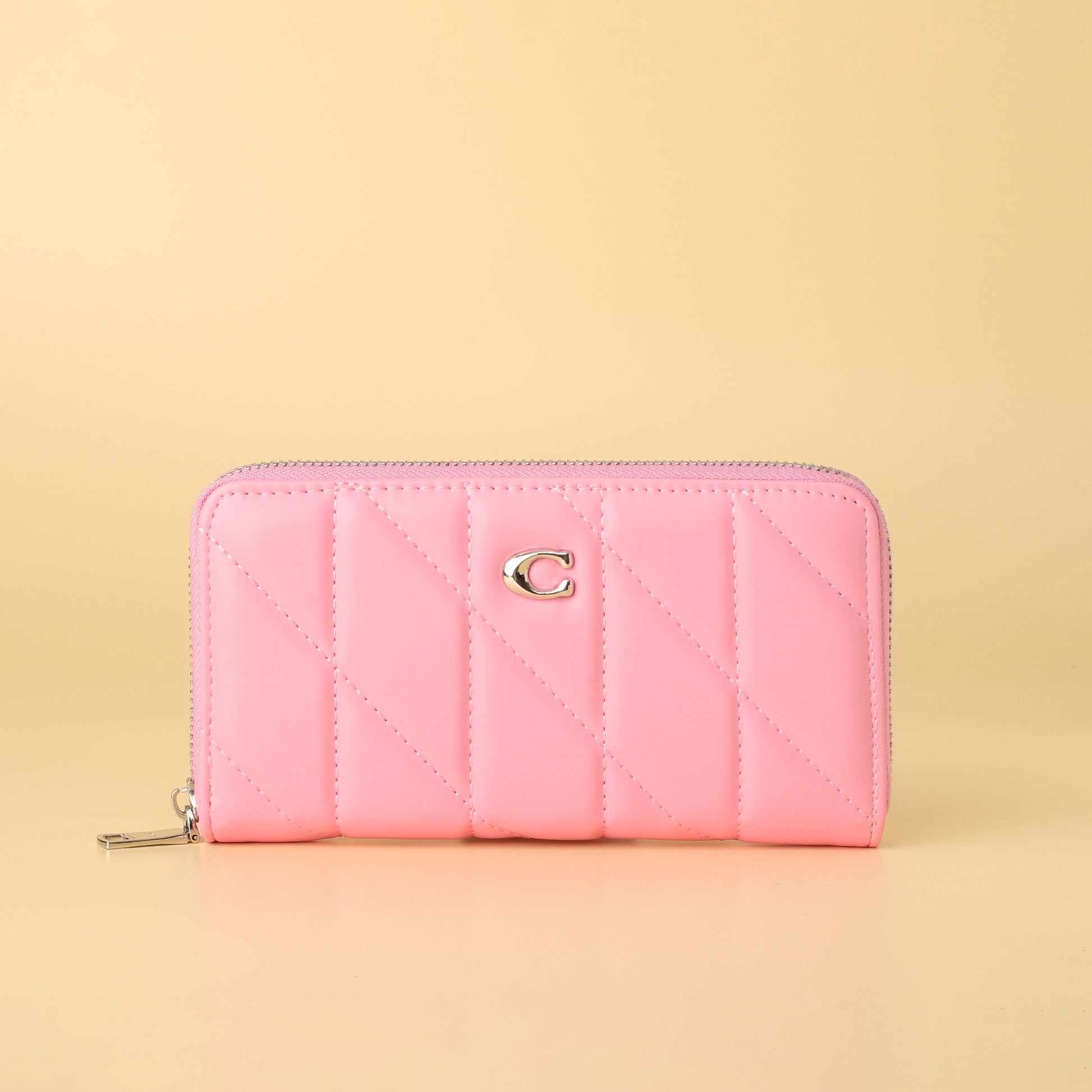 Bright, playful, and effortlessly chic, the Coach Quilted Zip-Around Wallet in Bubblegum Pink is the ultimate statement accessory. Featuring quilted stitching with the signature silver Coach "C" emblem, this wallet combines style and practicality. With multiple card slots, spacious compartments, and a central zip pocket, it keeps your essentials secure while adding a vibrant pop of color to your look.