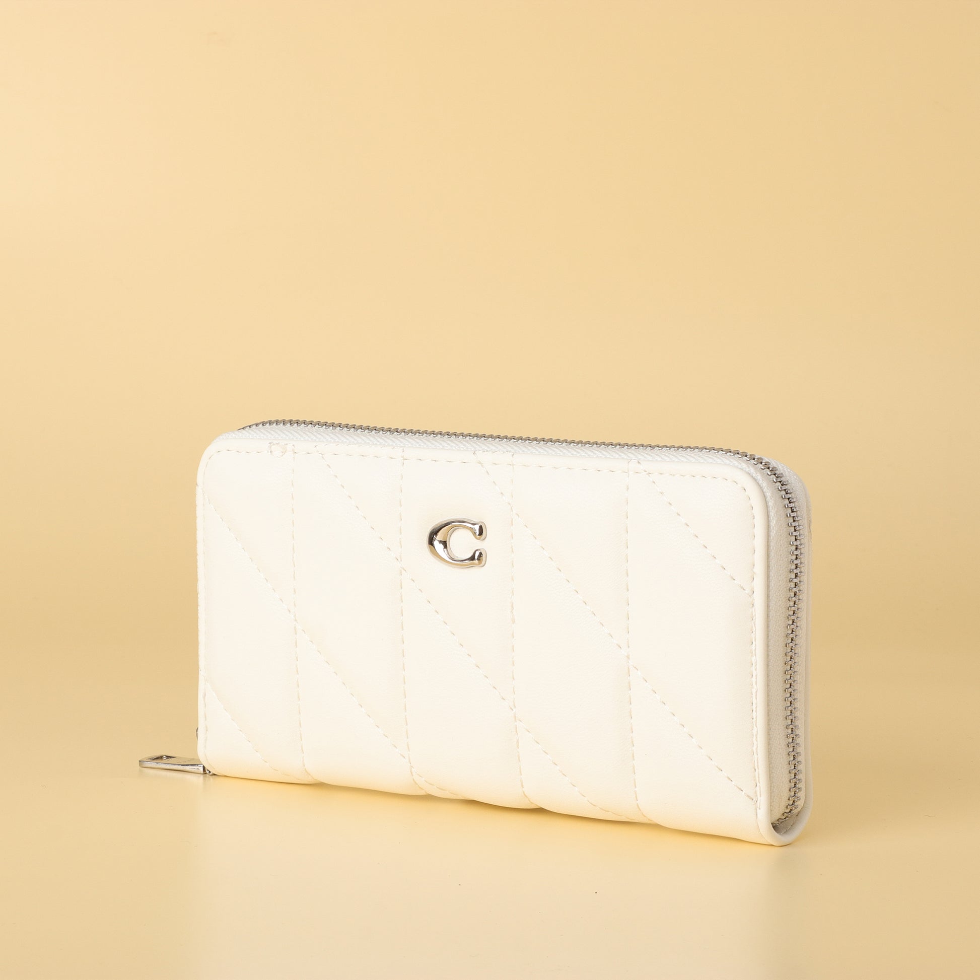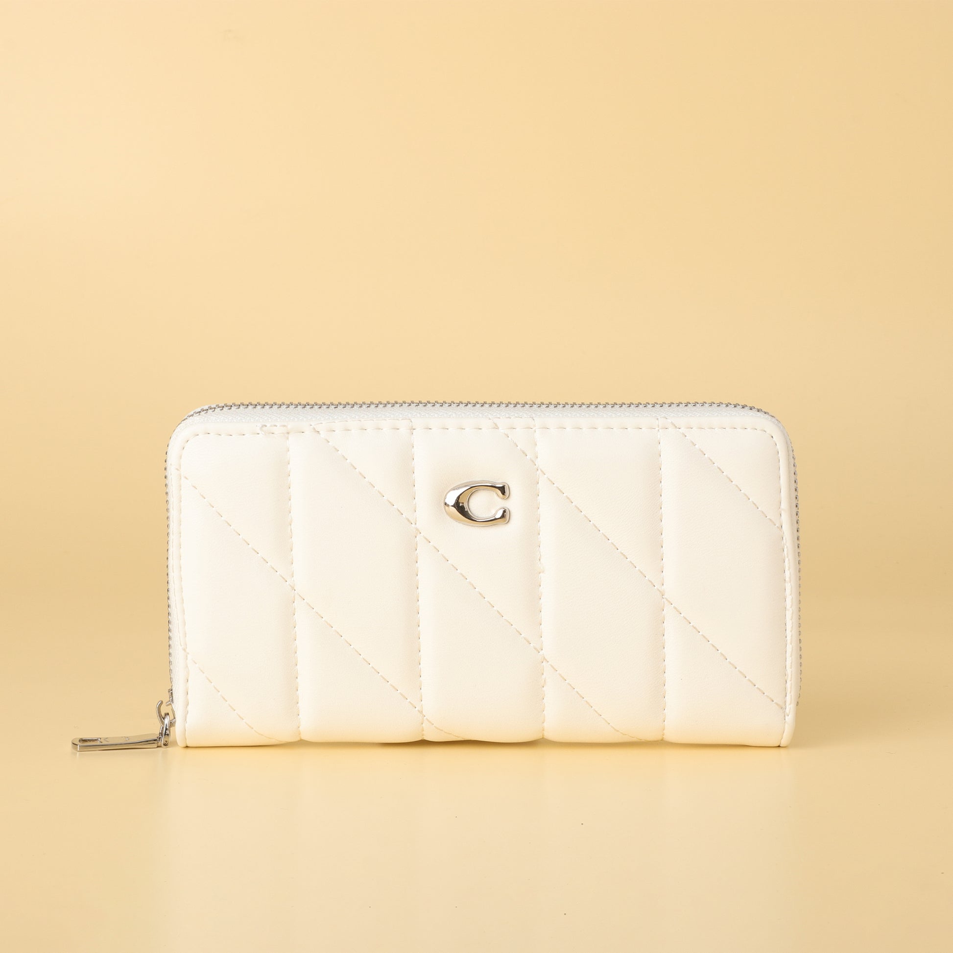 Elevate your everyday essentials with the Coach White Quilted Zip-Around Wallet, a perfect blend of luxury and functionality. Designed in premium quilted leather with a timeless white finish, this wallet exudes sophistication while keeping your belongings secure and organized. The silver-tone Coach logo adds a subtle designer touch, making it a versatile piece that pairs effortlessly with any handbag. Whether you’re headed to work, a night out, or weekend brunch, this women’s designer wallet complements every occasion with ease.