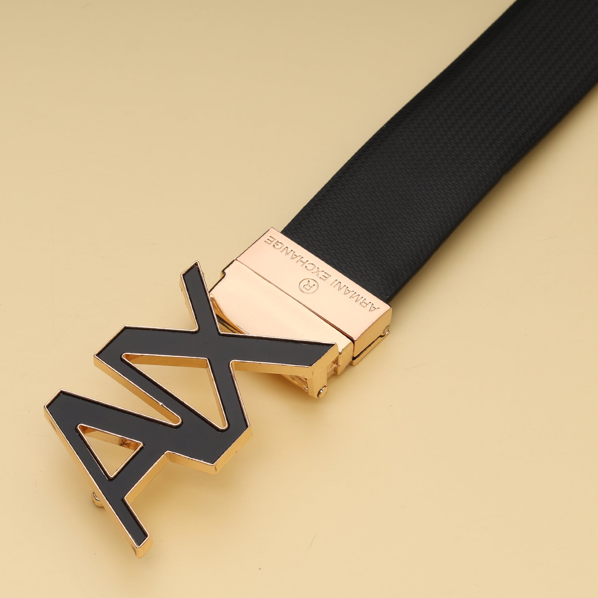 Make a bold impression with this Armani Exchange reversible leather belt, featuring a striking gold “AX” logo buckle. Designed for modern sophistication, its smooth black and brown finish offers dual styling options. Crafted with precision and edge, it’s a wardrobe essential for those who appreciate refined statement pieces.