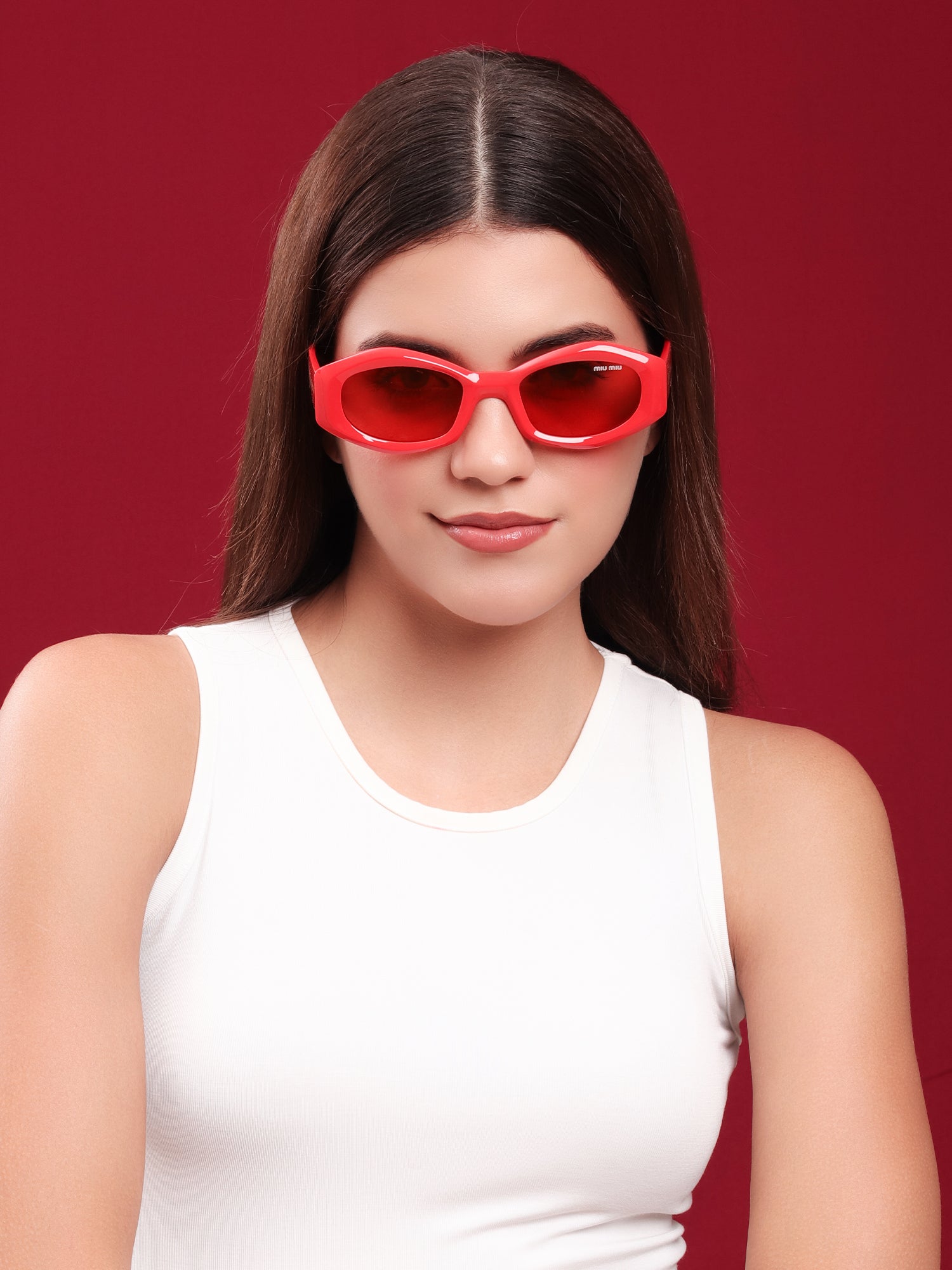 The Miu Miu Fire Red Modern Oval Sunglasses are the definition of statement eyewear, featuring vibrant red frames with matching oval lenses. Distinctive and playful, these sunglasses deliver bold Italian glamour and are finished with gold logo accents for a luxe touch. Keep them safe and stylish in the accompanying Miu Miu pink case—ready for any adventure.