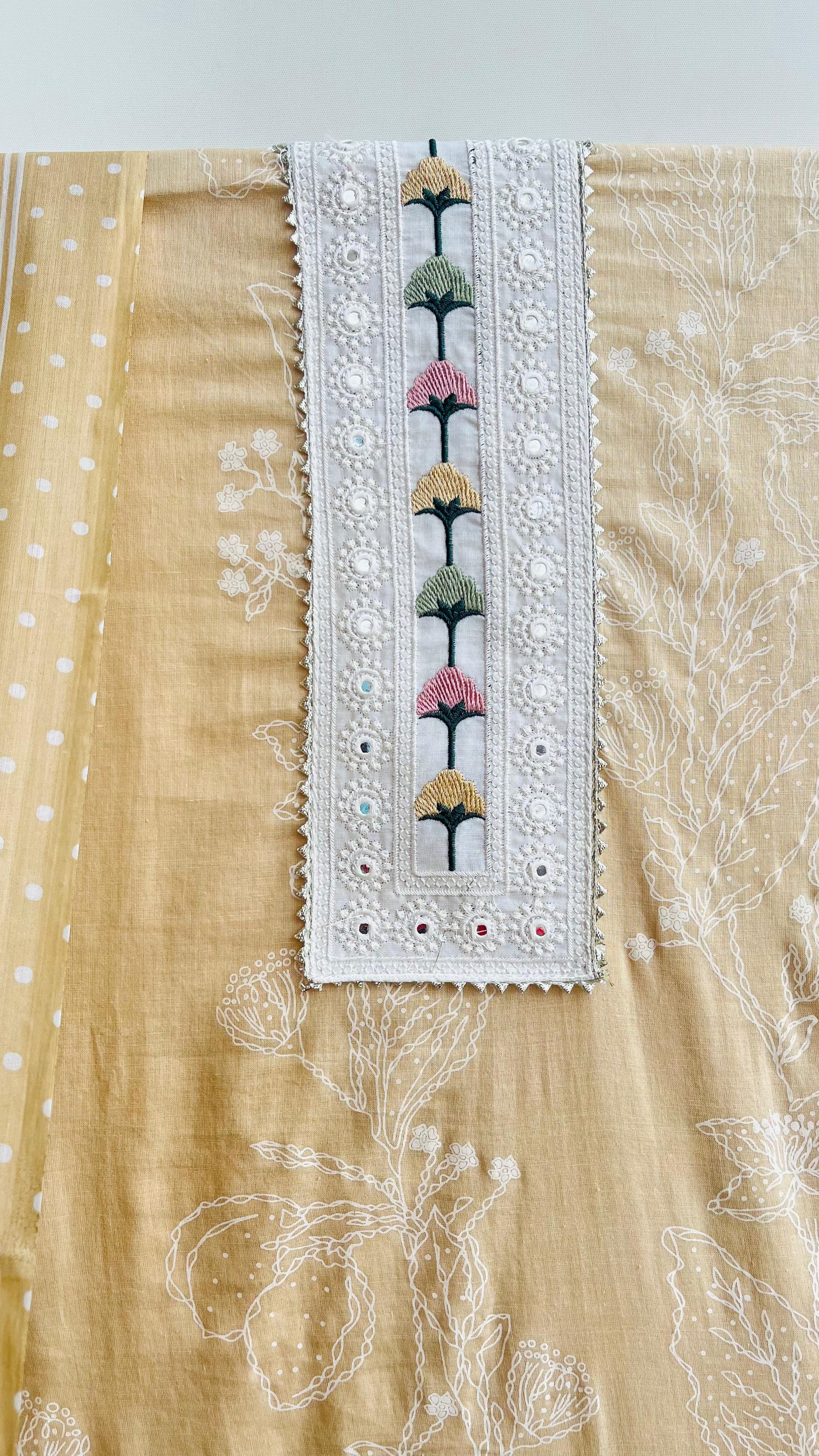 Embrace the elegance of our Golden Bloom unstitched suit, adorned with delicate floral motifs and classic polka dot patterns. The combination of soft hues and intricate embroidery creates a timeless piece perfect for any occasion. The suit comes with a matching dupatta embellished with subtle, yet exquisite detailing.
