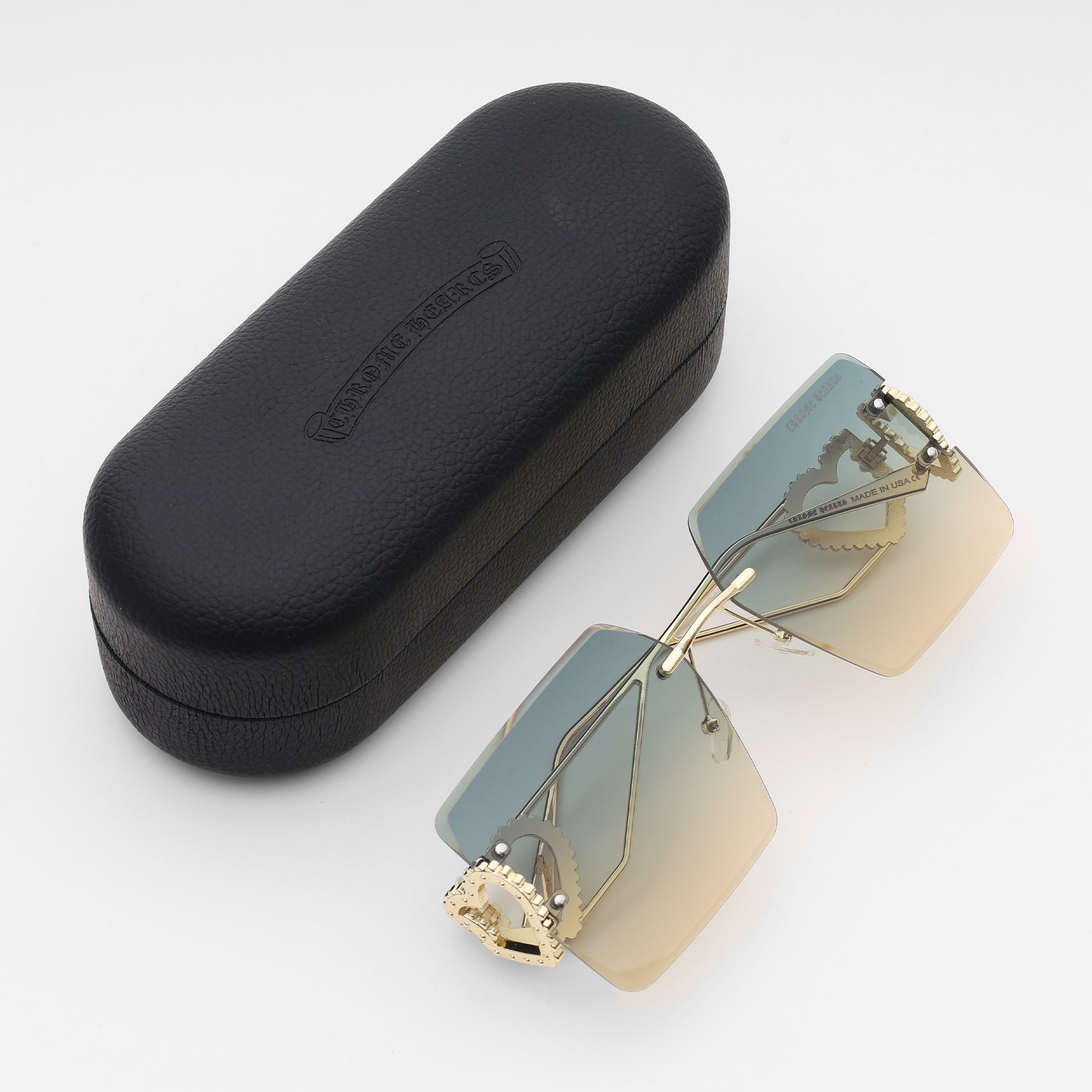Turn heads with the Chrome Hearts “Heart Luxe” Square Rimless Sunglasses, featuring gradient sky-to-sand lenses set in gold-tone metal frames. Iconic double heart embellishments at the hinge add a playful touch of romance, while the geometric silhouette brings sculptural elegance. Ultralight and decadent, these sunglasses make any moment feel special.