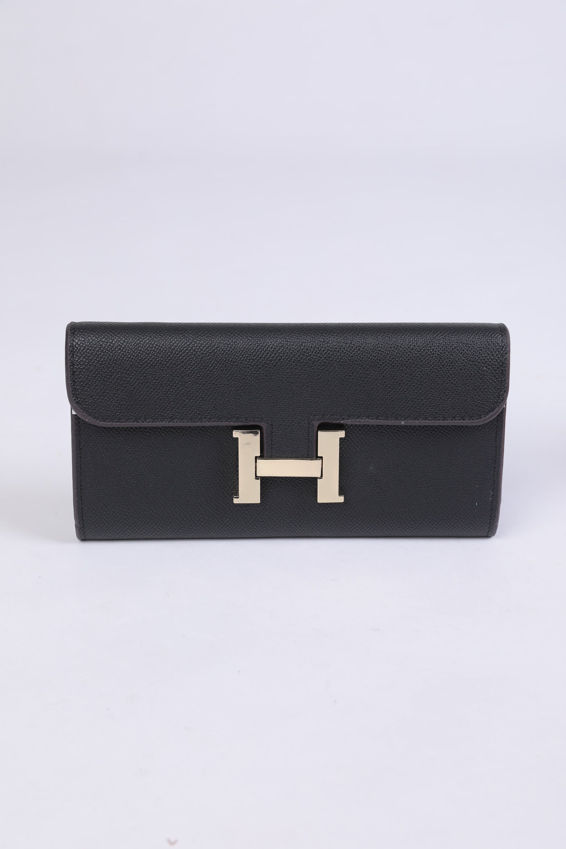 The Hermès Constance Long Wallet in Black is the epitome of understated luxury. Crafted from durable Epsom leather, this sleek design features the signature H clasp in silver-tone hardware and a well-organized interior for effortless elegance. The removable strap adds versatility, allowing it to be carried as a clutch or worn crossbody.