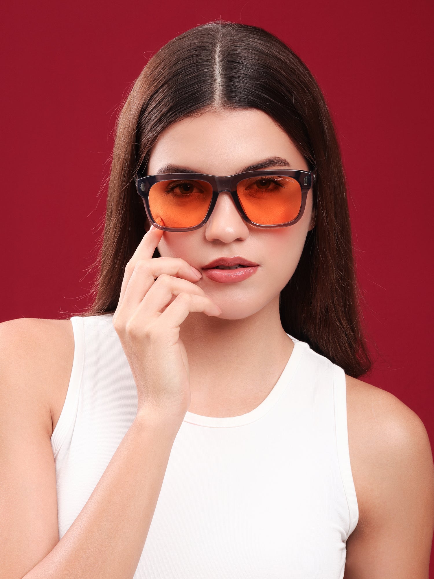 Play up the warm amber lens by pairing with crisp white basics or matching neutrals for chic contrast.