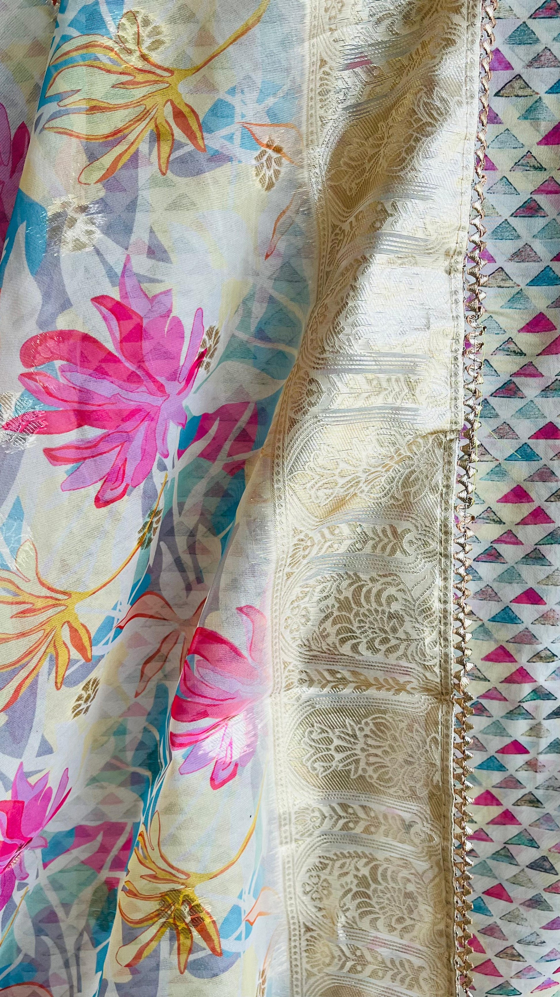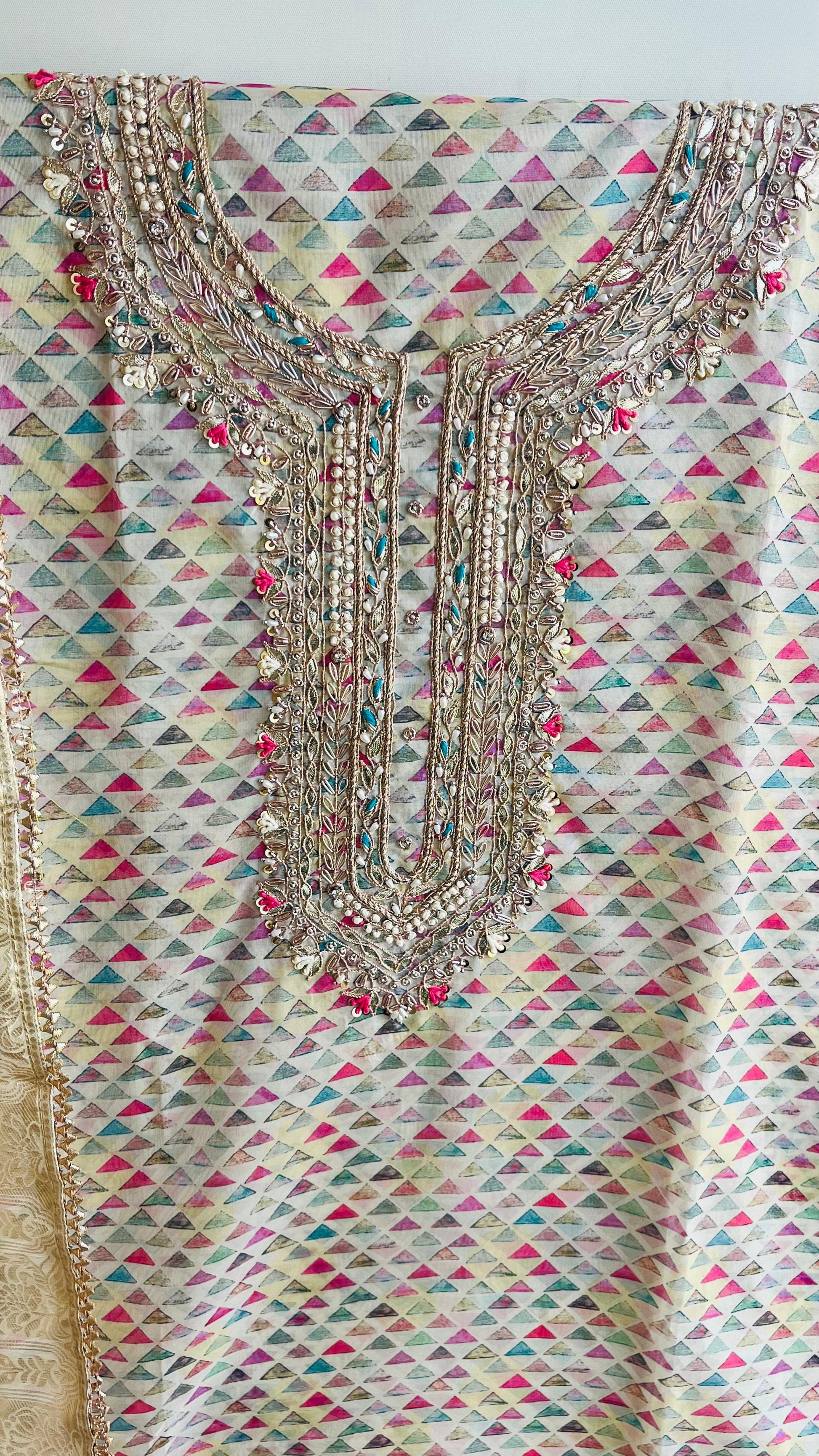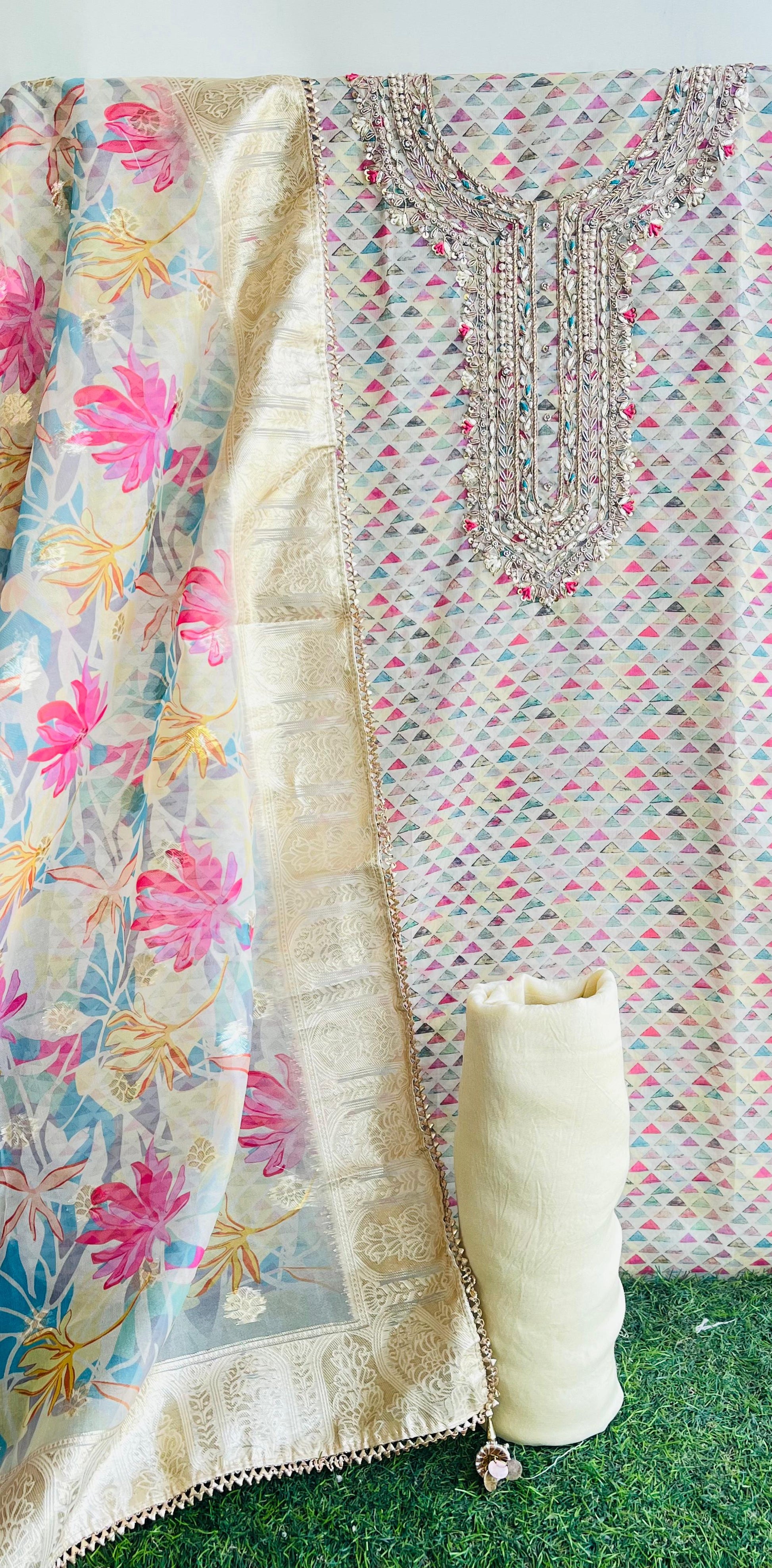 Elevate your wardrobe with our enchanting light lemon yellow unstitched suit, crafted from delicate floral print cotton fabric embellished with mesmerizing mirror work.