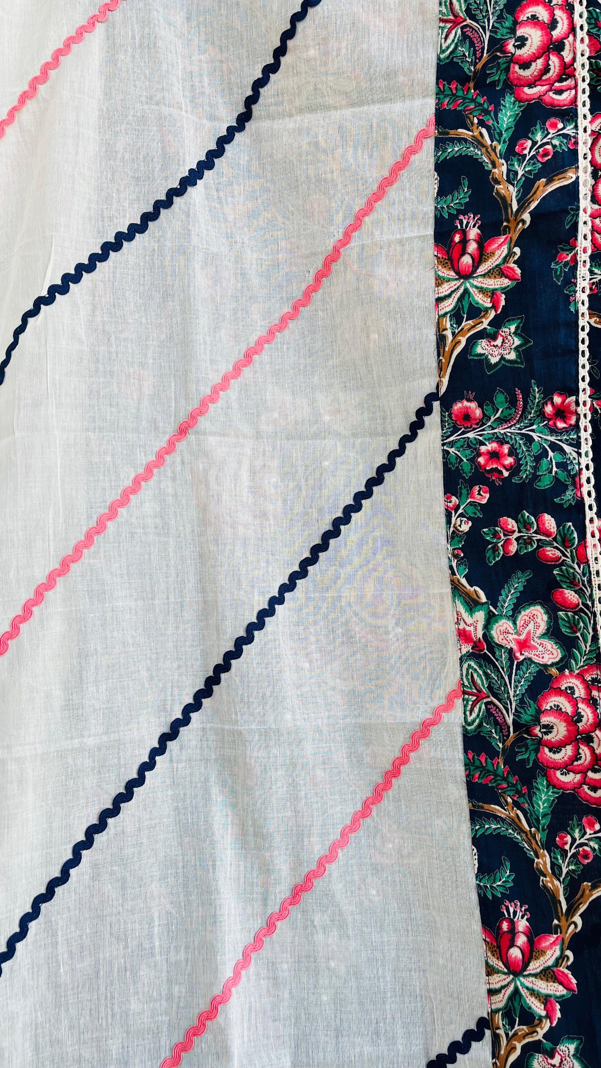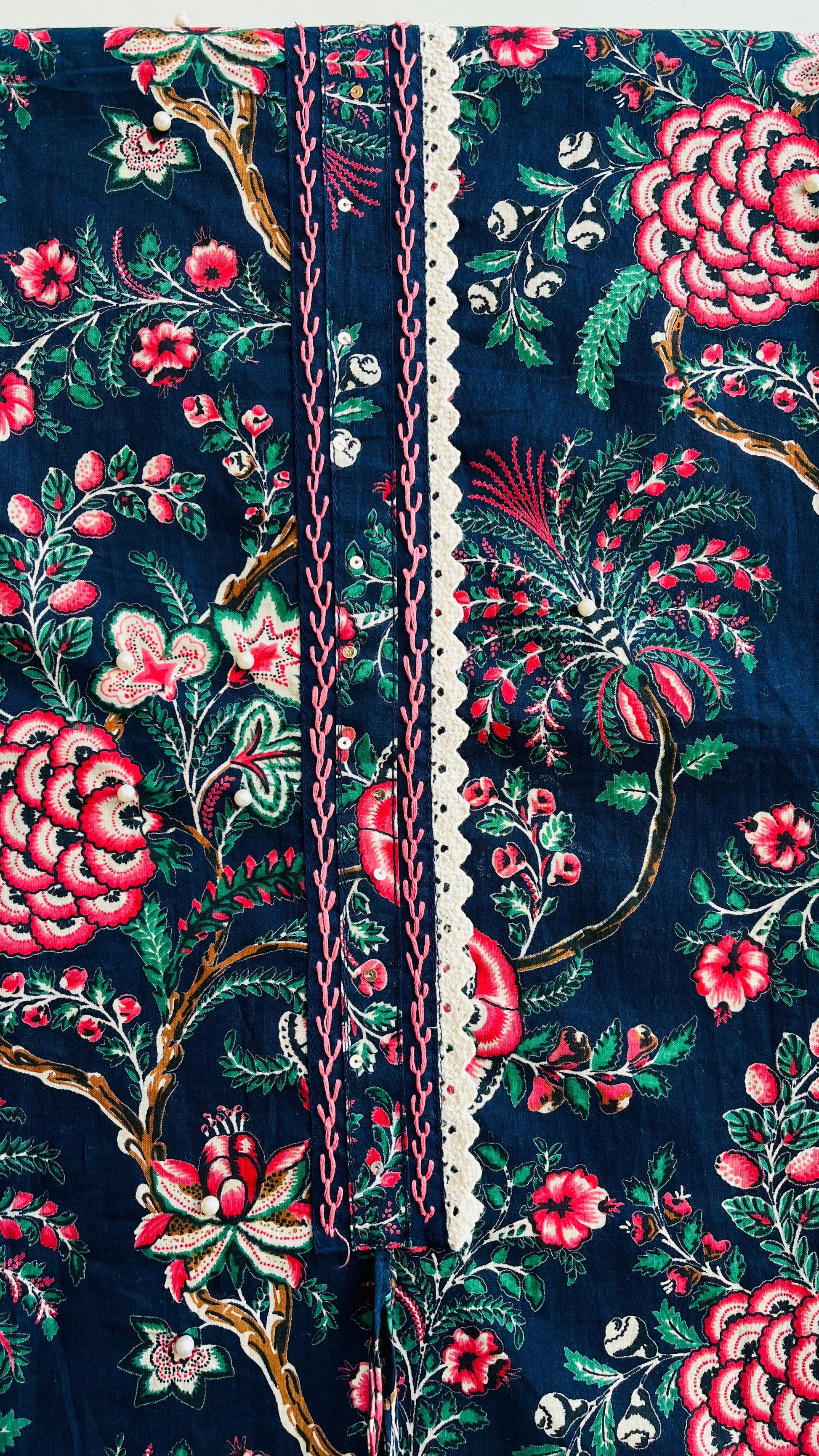 Immerse yourself in the enchanting beauty of our Midnight Garden unstitched suit. This stunning piece features rich, dark hues with intricate floral embroidery. The contrast of the deep blue fabric with vibrant floral patterns makes it a standout choice for evening events. The suit is complemented by a delicate dupatta with a subtle striped design.