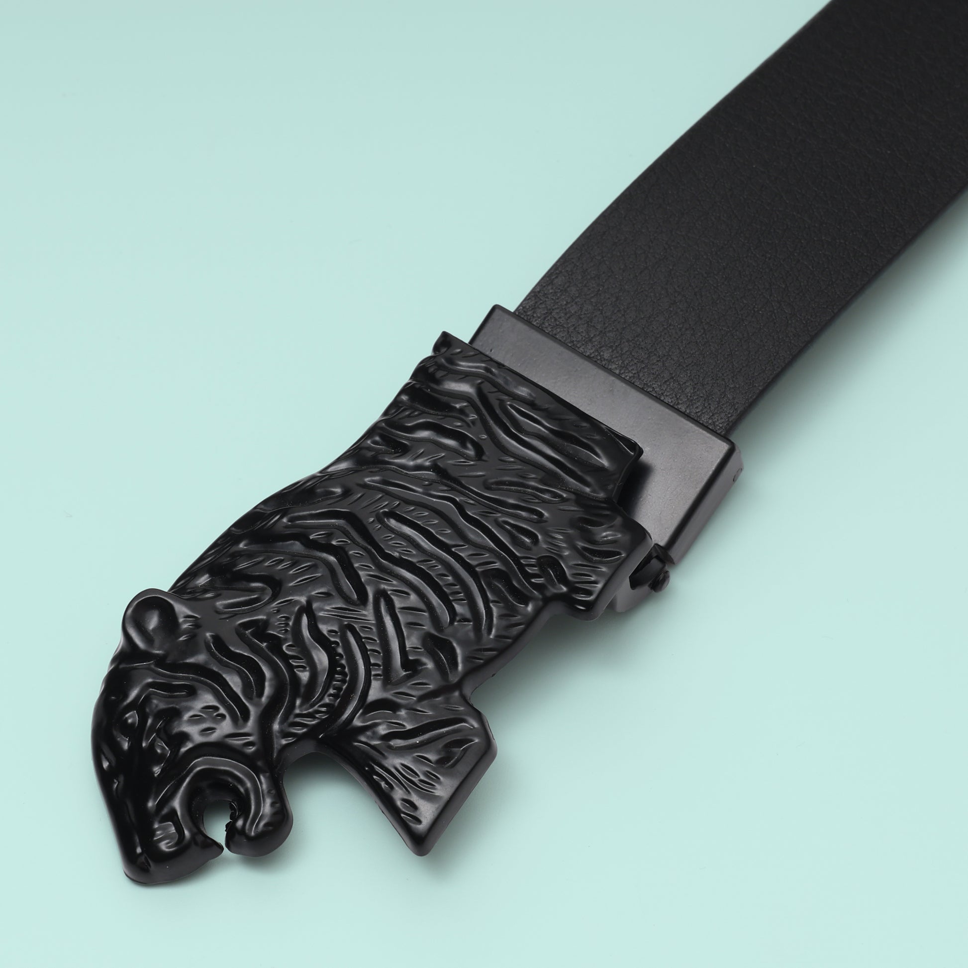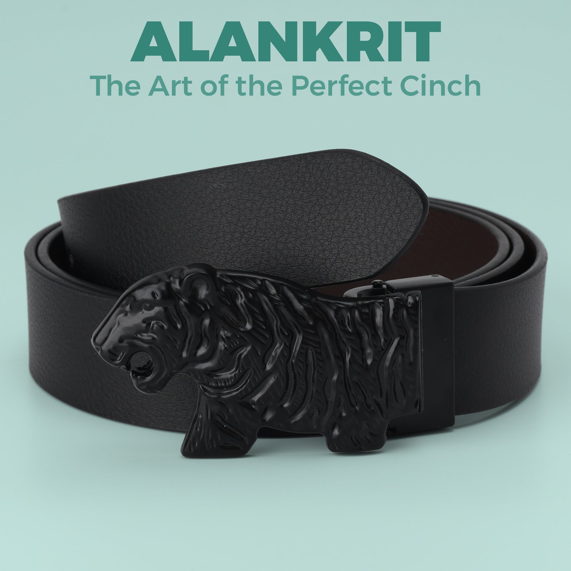 Power meets precision in this all-black statement belt by Alankrit. Designed with a sculpted tiger buckle in a sleek matte finish, this piece represents strength, confidence, and refined masculinity. The textured leather strap offers durability and comfort, while the reversible brown inner side adds versatility to your wardrobe.