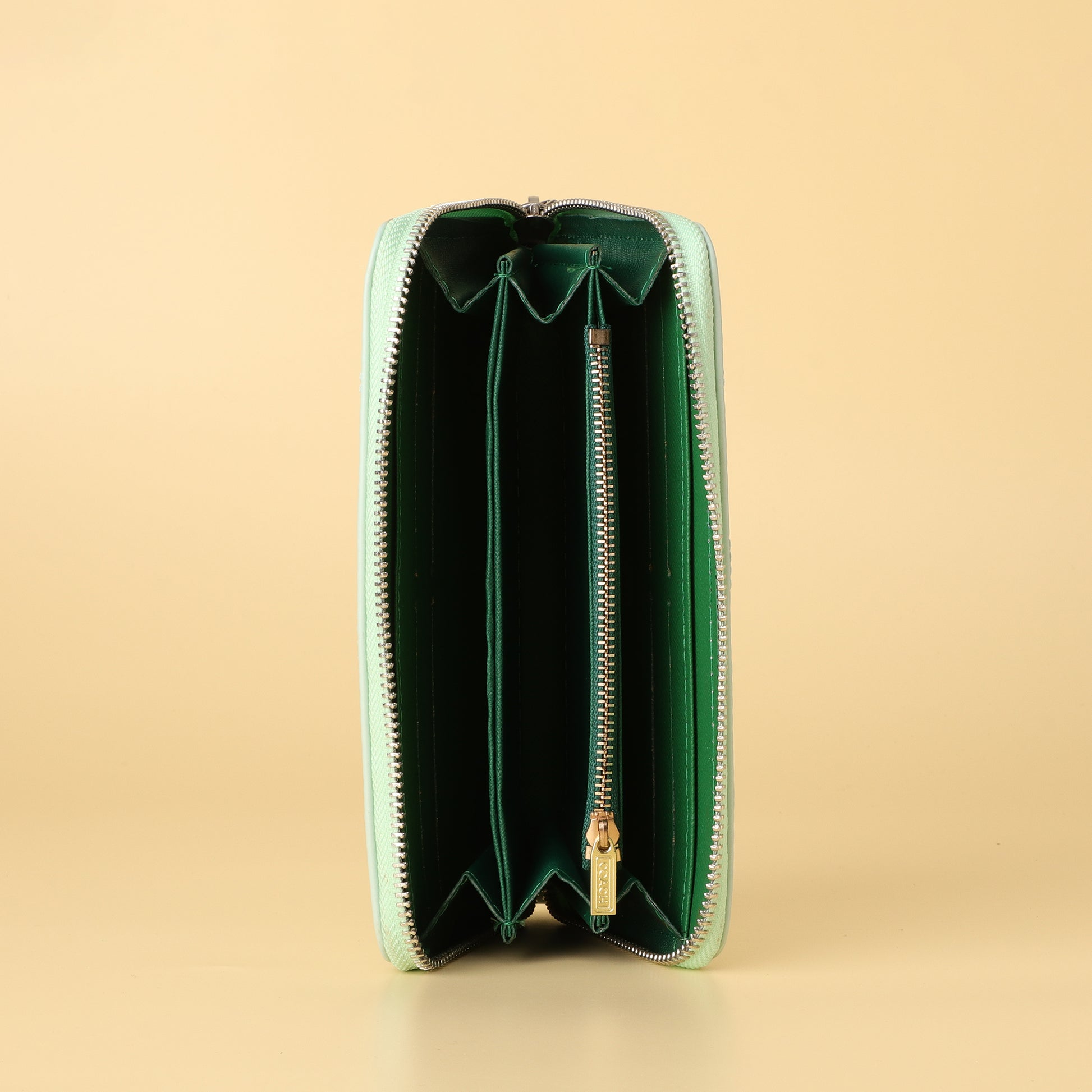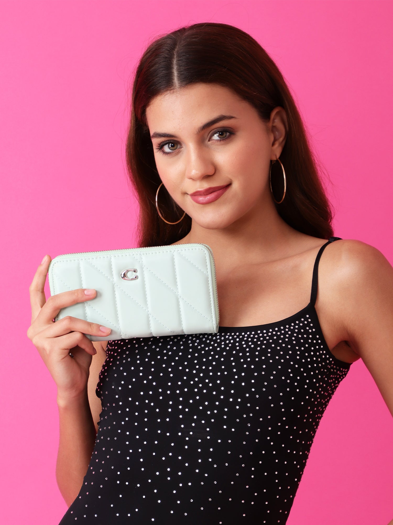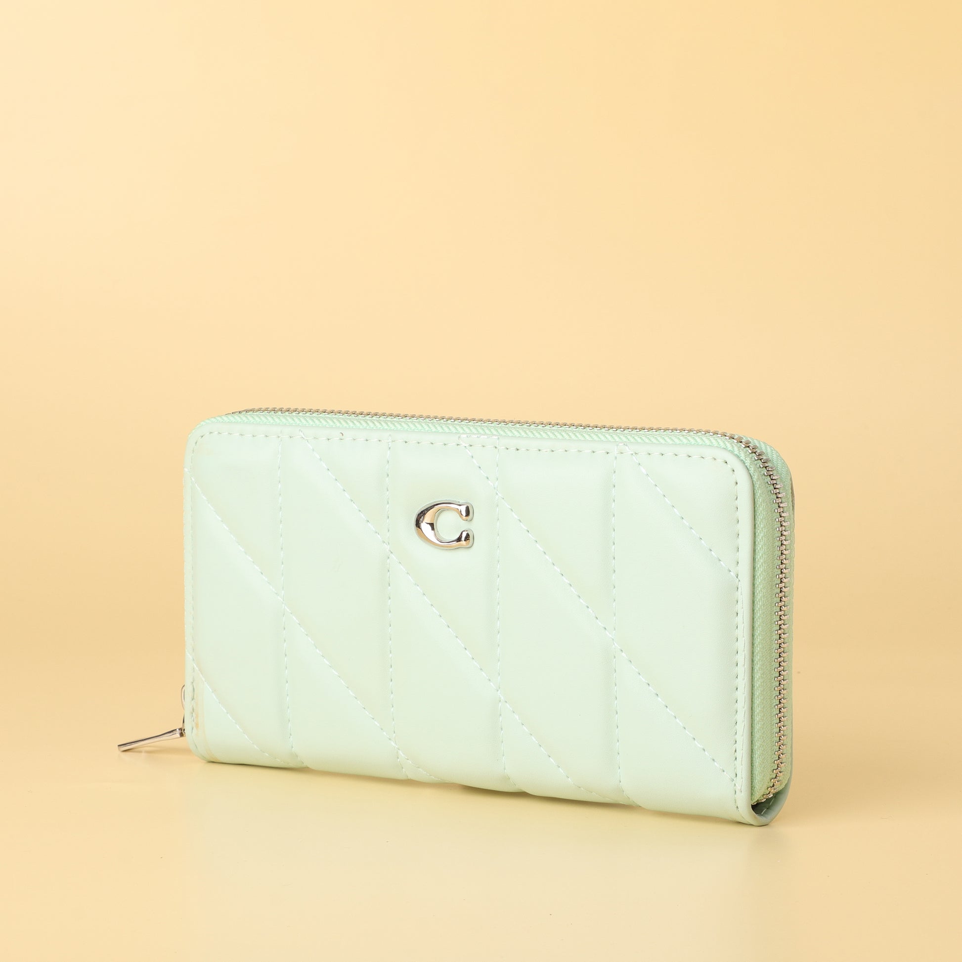 Fresh, modern, and effortlessly chic—the Coach Mint Green Quilted Wallet brings a pop of color to your everyday essentials. Crafted with soft quilted detailing and accented with the signature silver-tone "C" logo, this zip-around design combines elegance with functionality. Inside, you’ll find organized compartments, multiple card slots, and a secure coin pocket, making it the perfect blend of style and practicality.