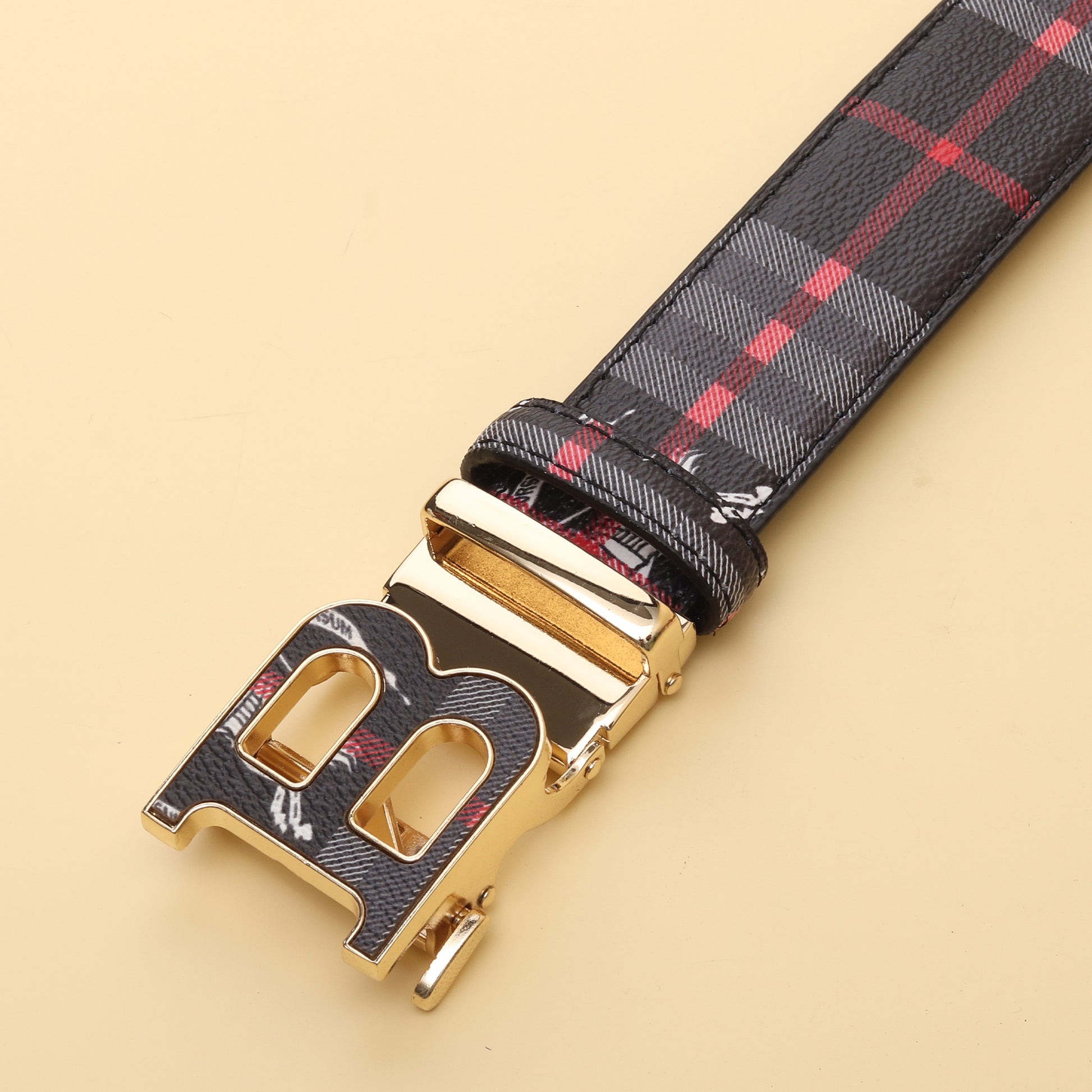 Crafted in signature Burberry check with a bold twist, this belt features the brand’s iconic plaid in black, red, and grey tones. The centerpiece is a striking gold “B” monogram buckle, adding instant sophistication. Designed in premium textured leather, it’s a statement accessory that balances timeless elegance with modern edge.