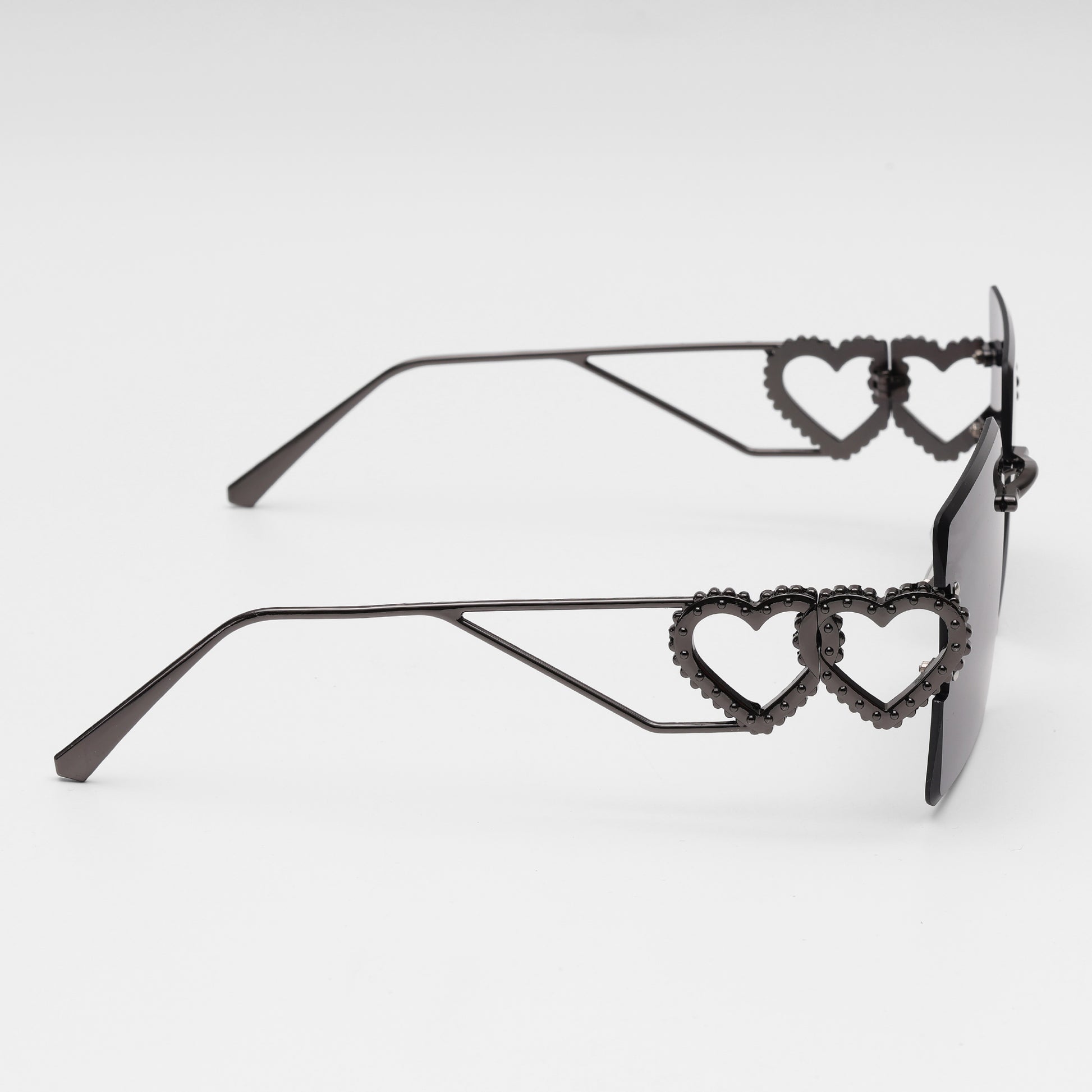 Bold, sleek, and unapologetically stylish — the Noir Heart Statement Shades redefine modern luxury. Featuring rimless square lenses in deep smoke grey, these sunglasses bring together a striking black metal frame with double-heart side accents. The result? A seamless blend of edge and elegance that turns every glance into a fashion moment.