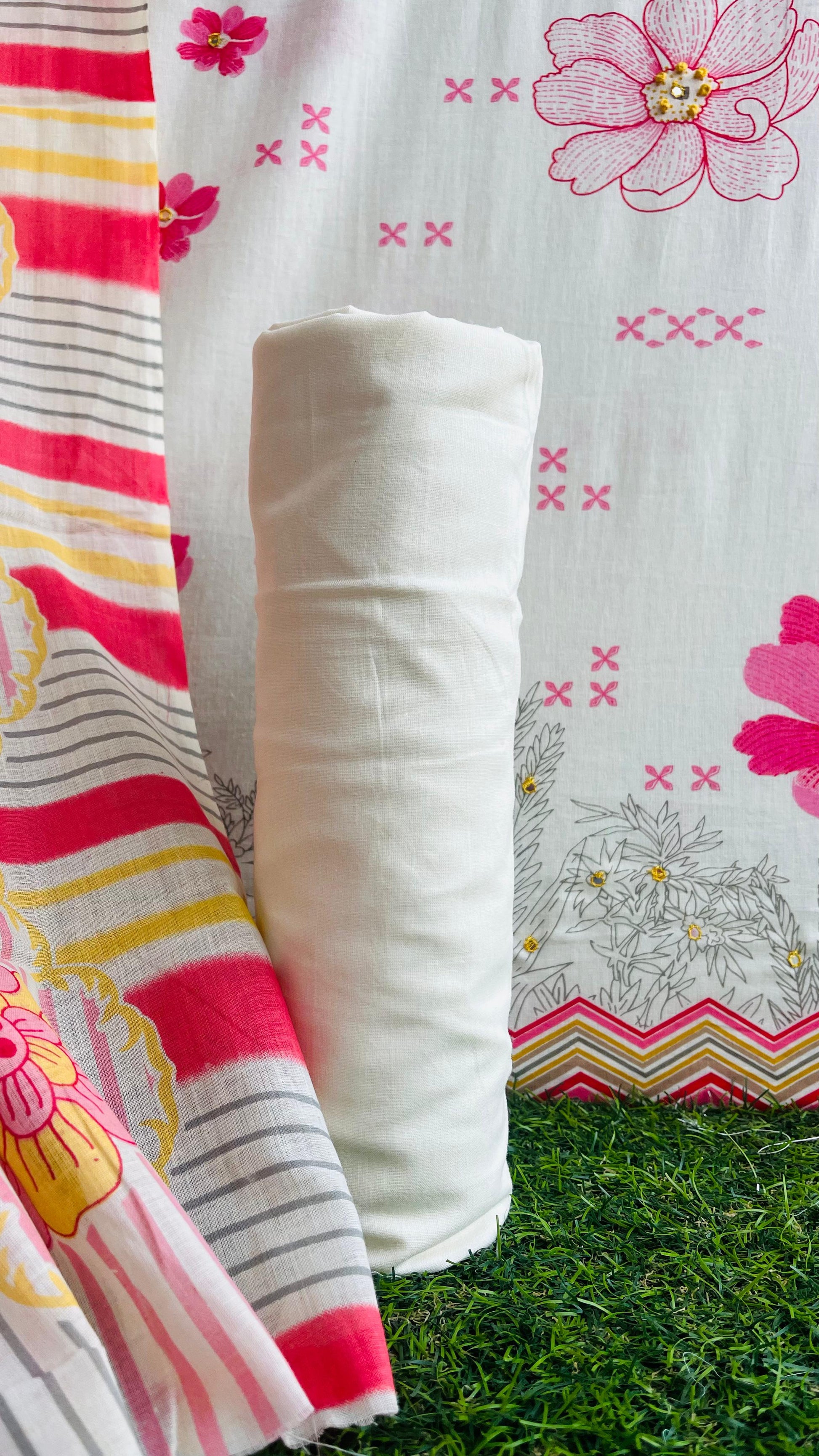 Celebrate the vibrant hues of spring with our Pink Blossom unstitched suit. Featuring lively pink and yellow floral patterns on a crisp white background, this suit brings a burst of color and joy to your wardrobe.