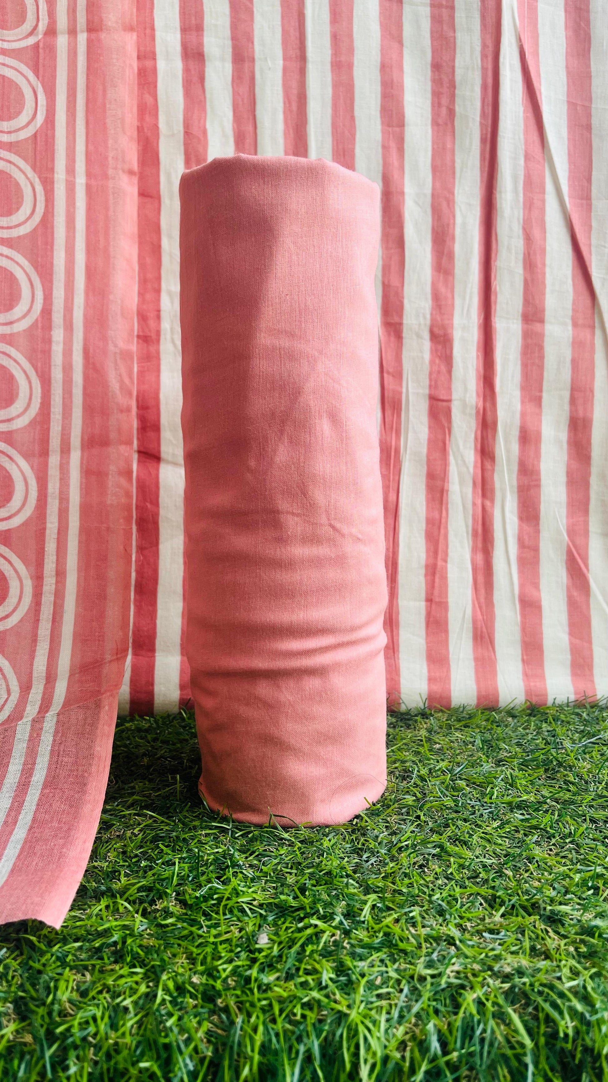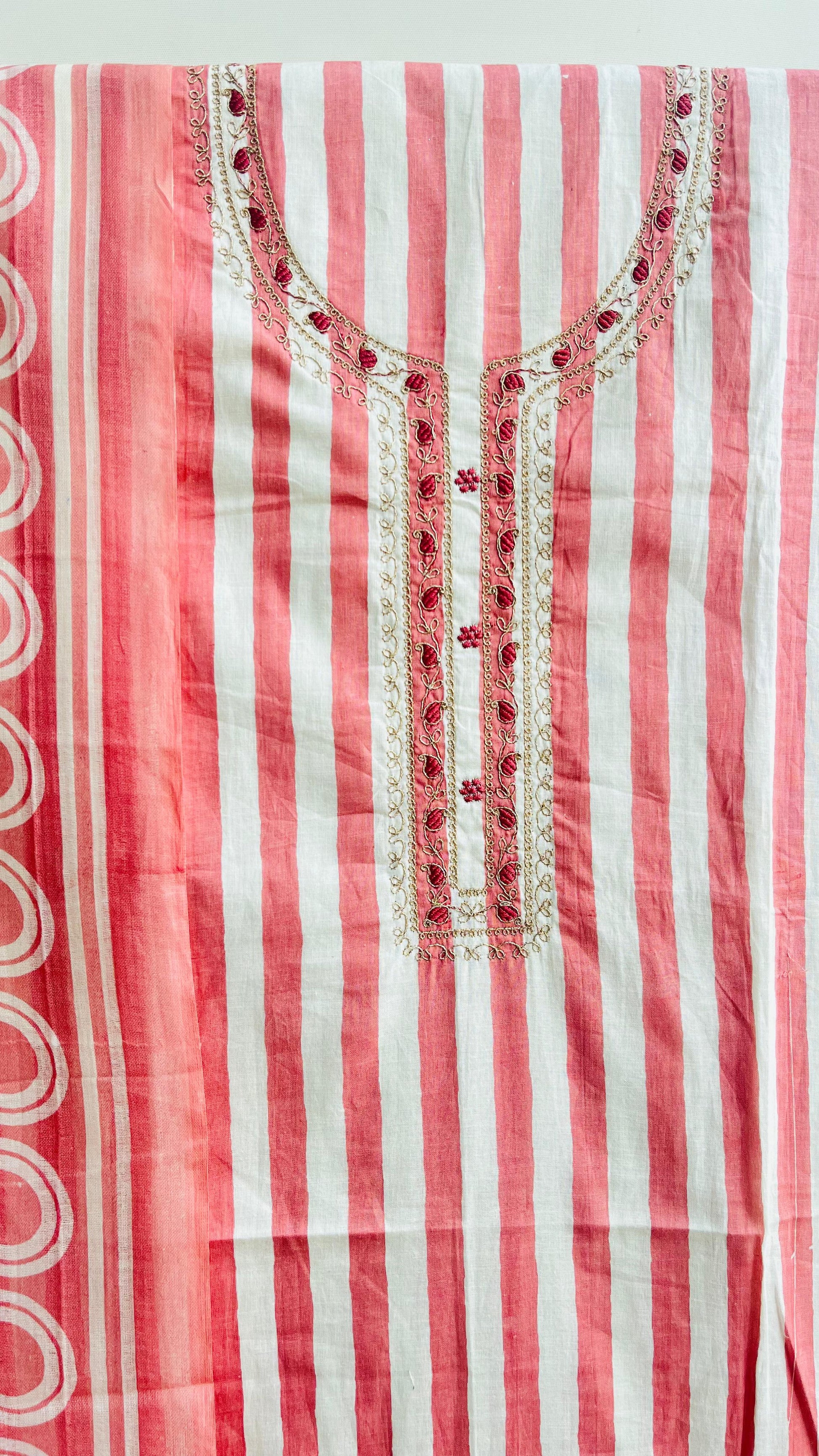Brighten your wardrobe with our Pink Delight unstitched suit, featuring a vibrant blend of pink and white stripes and circles. This playful design is perfect for adding a pop of color to your day.