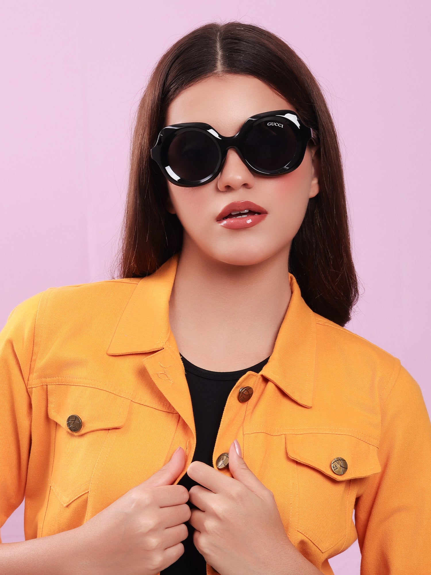 Step up your accessories game with these Gucci round sunglasses, crafted in a high-gloss black finish for standout allure. The circular frames, iconic gold branding, and luxe brown case offer a combination of bold retro flair and unmistakable designer sophistication. These statement shades deliver both comfort and unmistakable fashion credibility, every time you step out.