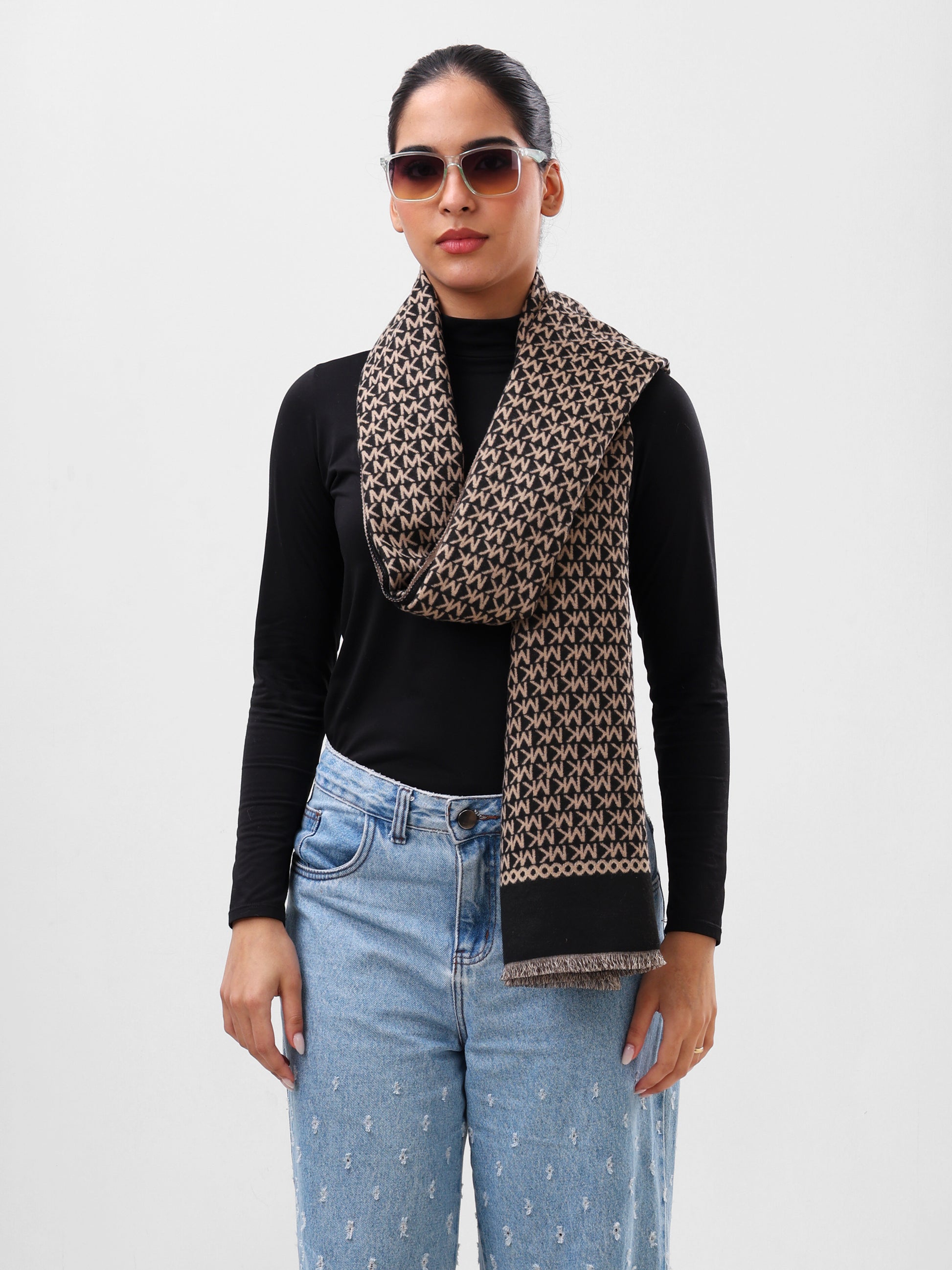 This scarf keeps things sleek and understated with its all-over monogram pattern and classic black-and-tan palette. It has that quiet luxury feel that works effortlessly with everyday outfits, while the soft texture and clean finish make it easy to wear from morning to night.