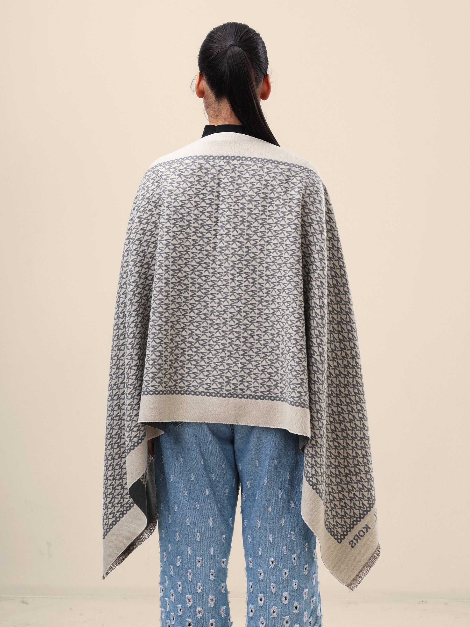 This scarf keeps things clean, classic, and effortlessly refined. The soft grey tone is layered with a subtle all-over monogram pattern, framed by a contrasting border that adds just enough structure. Finished with neat fringed edges, it feels polished without being stiff—an easy choice for everyday luxury.