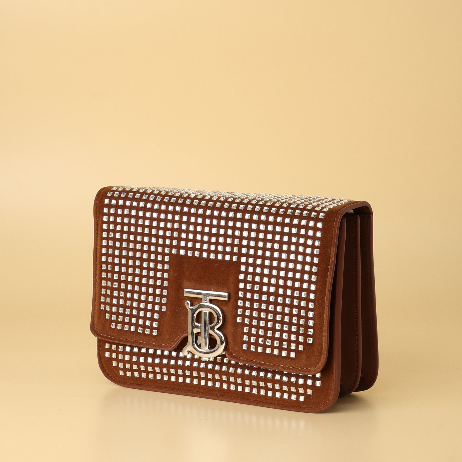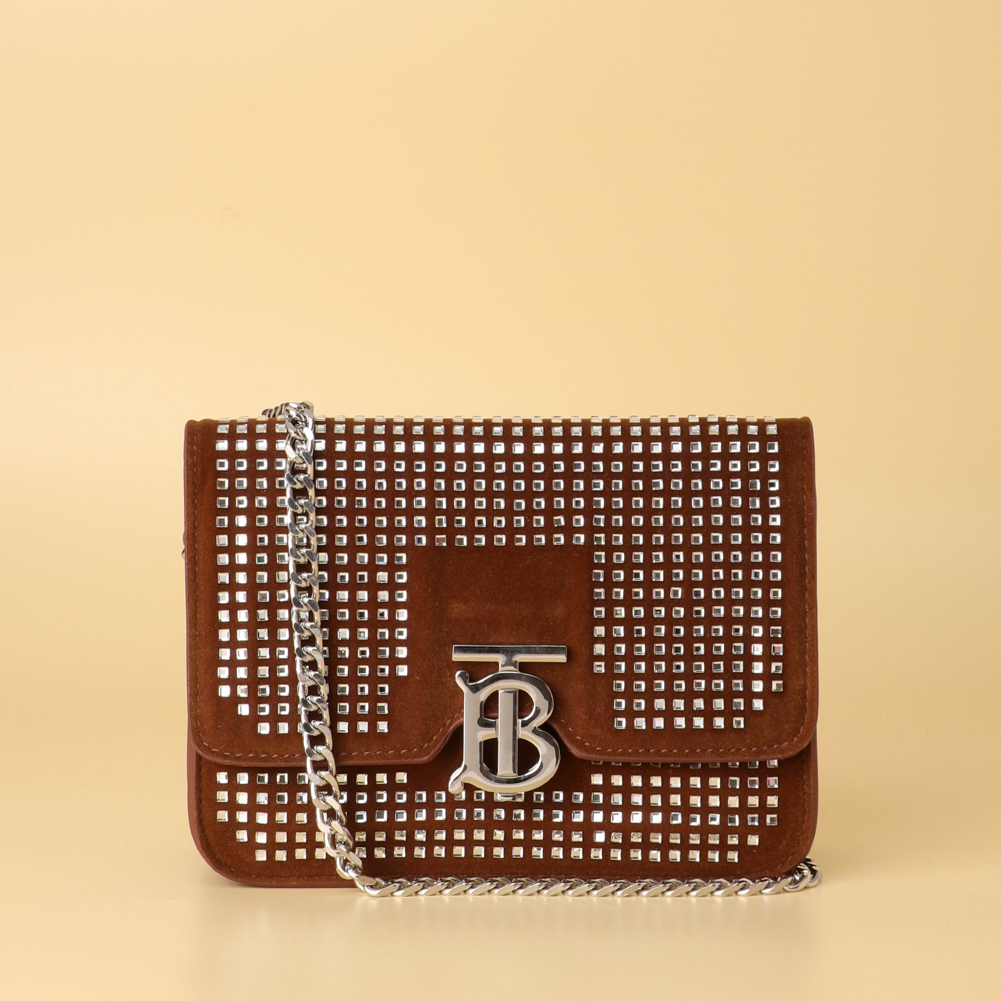 Striking and sophisticated, the Burberry TB Monogram Bag in rich chestnut suede is elevated with studded square embellishments and finished with the iconic Thomas Burberry monogram clasp in polished silver. The sleek silhouette is paired with a silver-tone chain strap, making it a statement piece that transitions seamlessly from day to evening.