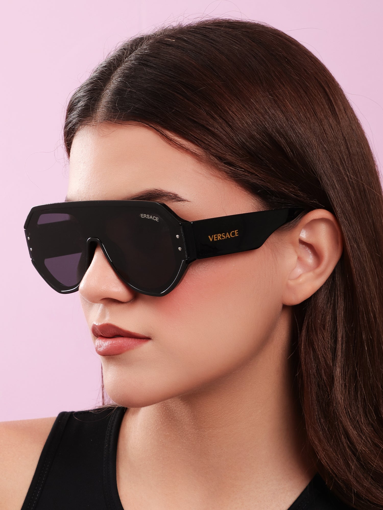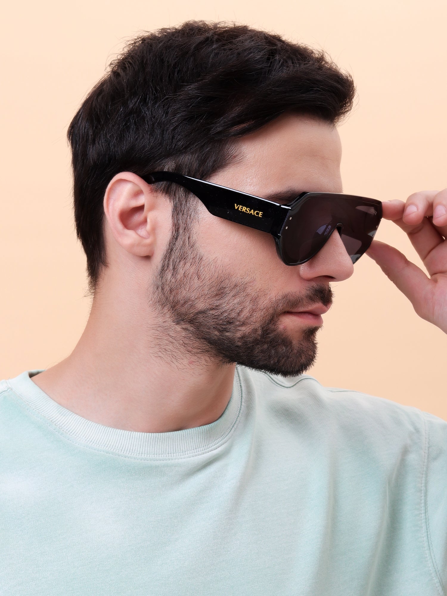 Versace Urban Eclipse Sunglasses stand out with their angular shield frame, deep black acetate, and smoke-grey lenses. Gold Versace branding and chic rivet accents add unmistakable opulence and edge, while the structured fit offers comfort and maximum coverage. These are bold, contemporary shades designed for those who turn every street into a runway.