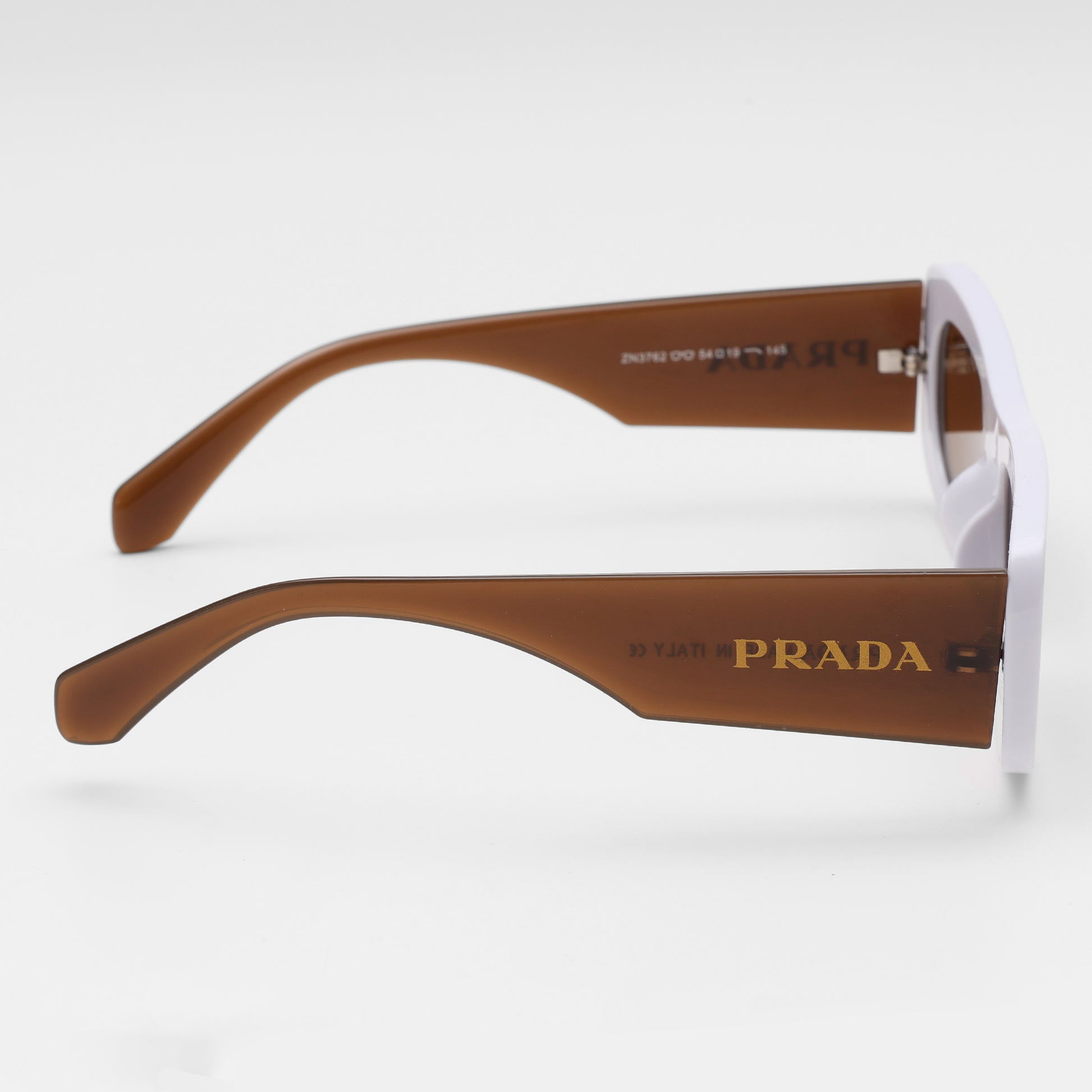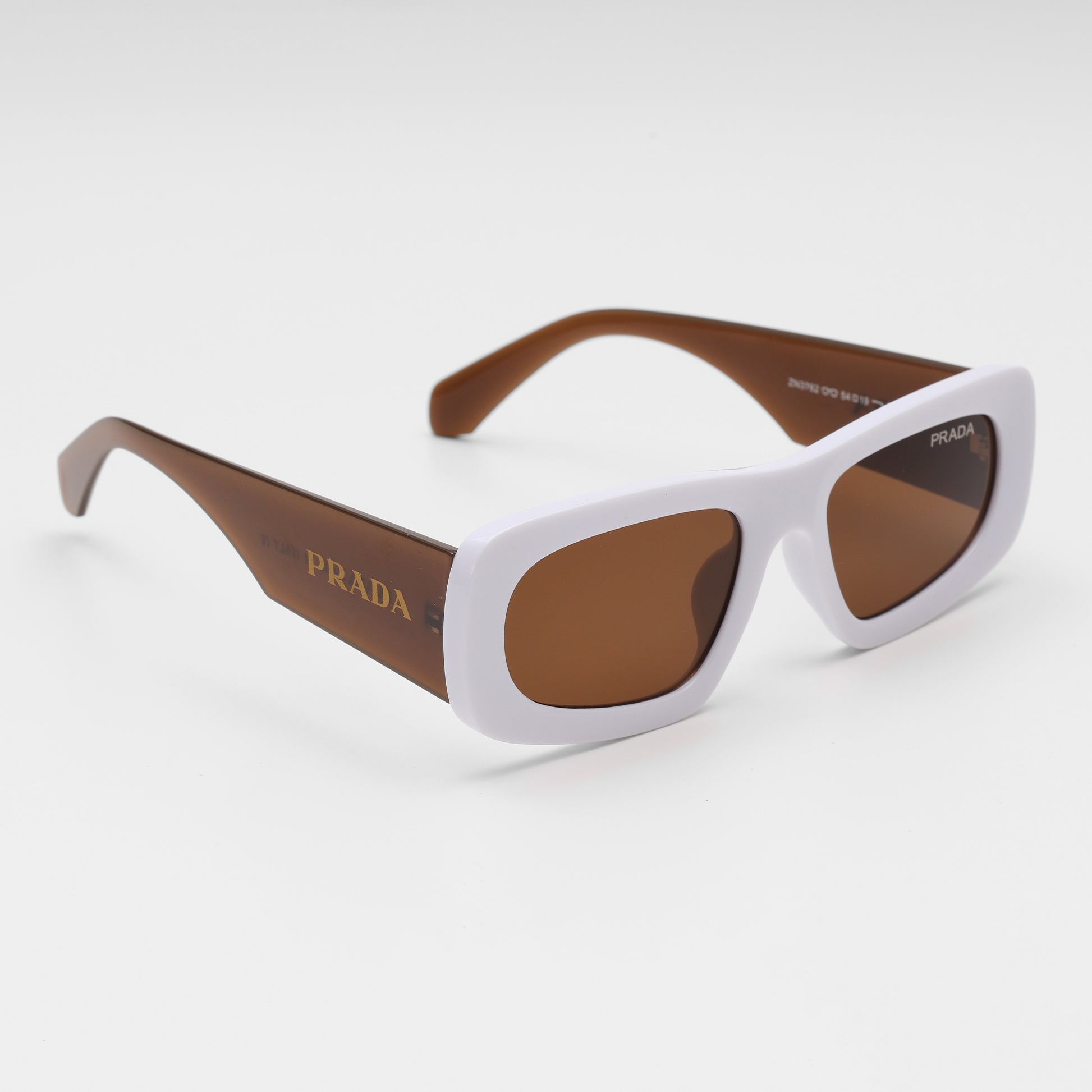 The Prada White Frame Rectangle Sunglasses make a standout statement with crisp white rectangular frames, rich brown temple arms, and perfectly matched coffee lenses. The bold contrast and minimal logo detailing create a design-forward look, all tucked away in Prada’s signature red and black case for a sharp, modern finish.